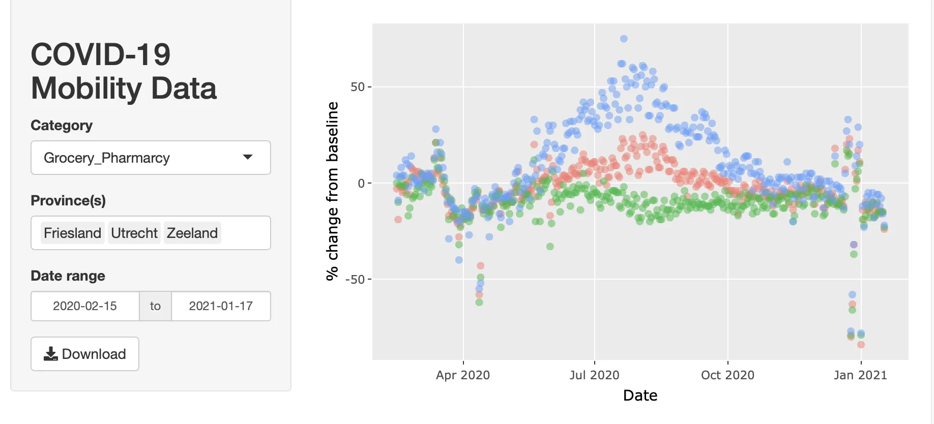 This example illustrates how to create a Shiny app which allows you to interactively explore Google’s COVID-19 Community Mobility Reports of the Netherlands through an intuitive visual interface (see the live version here).