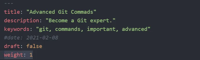 A weight set equal to 1 will place your section in the first place, likewise the prior example. If you wish to make it appear after other sections, make sure to give it a higher weight.