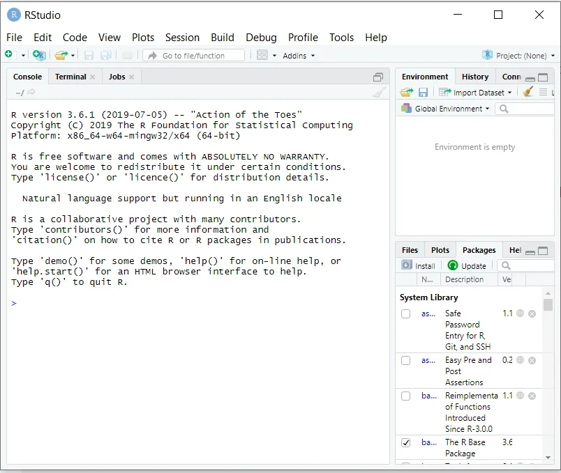Open RStudio from the start menu. You should see the version corresponding to the one chosen on the website.