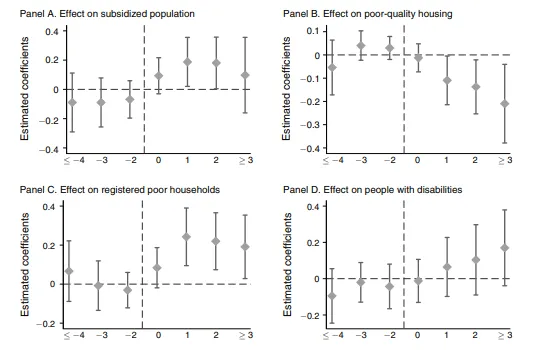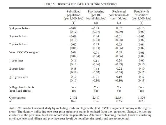 He and Wang (2017) study the effect of the allocation of so-called college graduate village officials (CGVOs) to rural communities in China on poverty alleviation. CGVOs are assigned bureaucratic roles in villages to help local governments successfully implement the central government’s anti-poverty policies. The idea behind the policy is that college graduates should be more able and efficient administrators than rural government leaders. They use a staggered difference-in-differences design, exploiting the fact that CGVOs were allocated to villages in a staggered (gradual) fashion. For example, village A might have been assigned a CGVO in 2001, village B in 2004, and village C in 2005. They test for the parallel trends assumption by testing for the statistical significance of between-group differences in their four outcomes of interest for each of the pre-treatment periods they have in their sample: