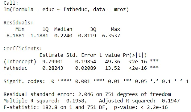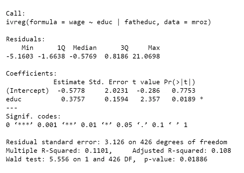 Hence, intuitively fatheduc could be a good candidate for a IV but let us check if it indeed fulfills these criterion.