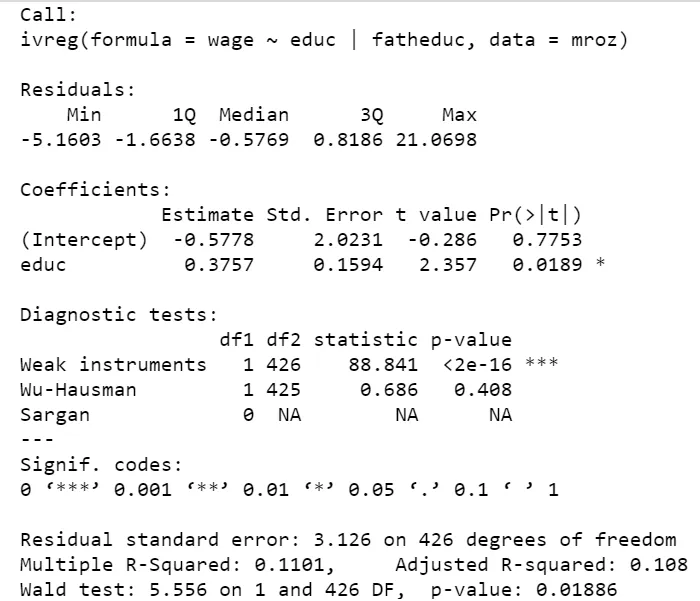 The Sargan test is a test of overidentification. That is, in an overidentified regression equation, where there are more instrumental variables than coefficients to estimate it is possible that the instrumental variables provide conflicting information about the values of the coefficients. Unlike in the other 2 tests, a large test statistic and small p-value for the Sargan test suggest that the instruments are not valid. In our case, we obtain NA values for this test as we have an equal number of instrumental variables and coefficients.