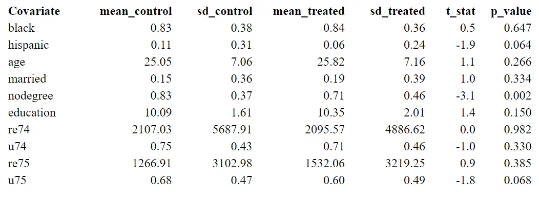 Significant differences in some characteristics (p-value < 0.05) suggest an imbalance between the two groups. For example, since people with no degree are more likely to drop out of the treatment group, the amount of people with nodegree is significantly higher in the control group. If people with nodegree have lower earnings independent of whether they received a program, the treatment effect is likely to be overestimated. Matching offers a solution, where we can control for this kind of covariates.