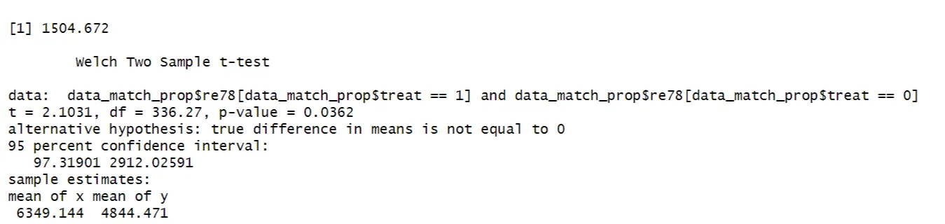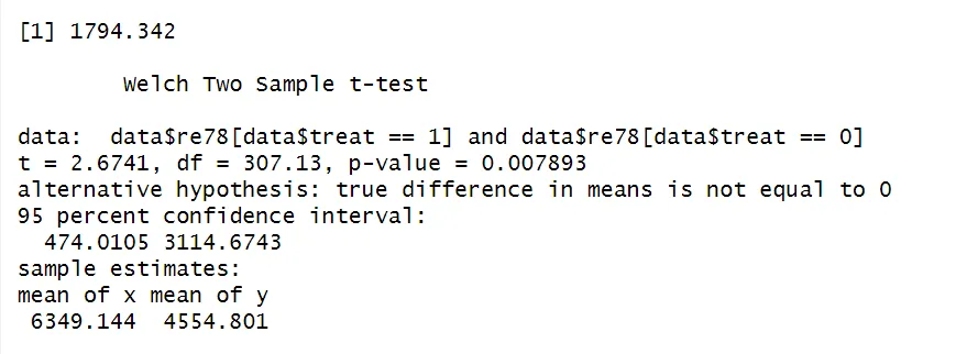 The difference-in-means estimate 1794.342 is returned. Additionally, a two-sample t-test compares the re78 values between the treatment and control group and tests the null hypothesis that the means of the two groups are equal. The p-value lower than 0.05 (here, 0.007) indicates the means are statistically significant different from each other.