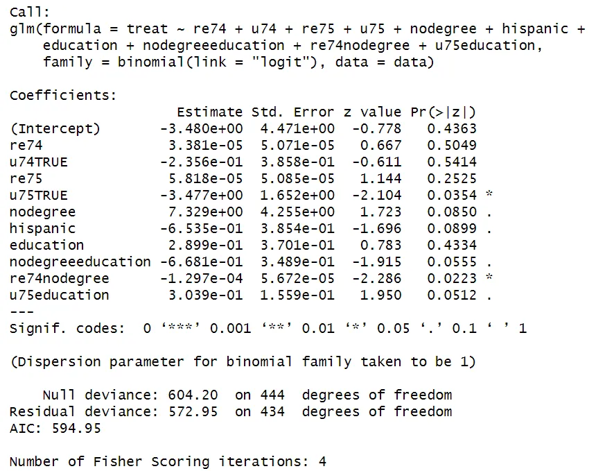 propreg = glm(treat ~ re74 + u74 + re75 + u75 + nodegree + hispanic + education + nodegreeeducation + re74nodegree + u75education, family = binomial(link = "logit"),data=data)