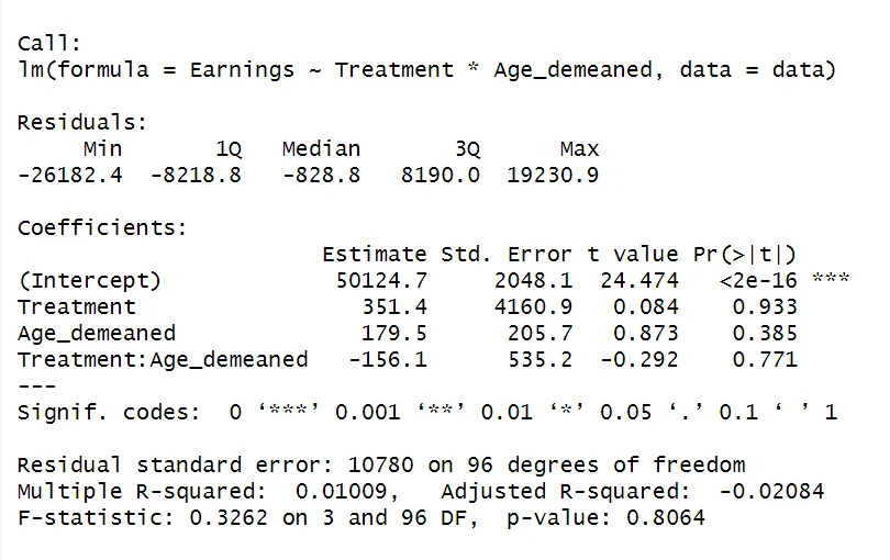 ols_model <- lm(Earnings ~ Treatment * Age_demeaned, data = data)