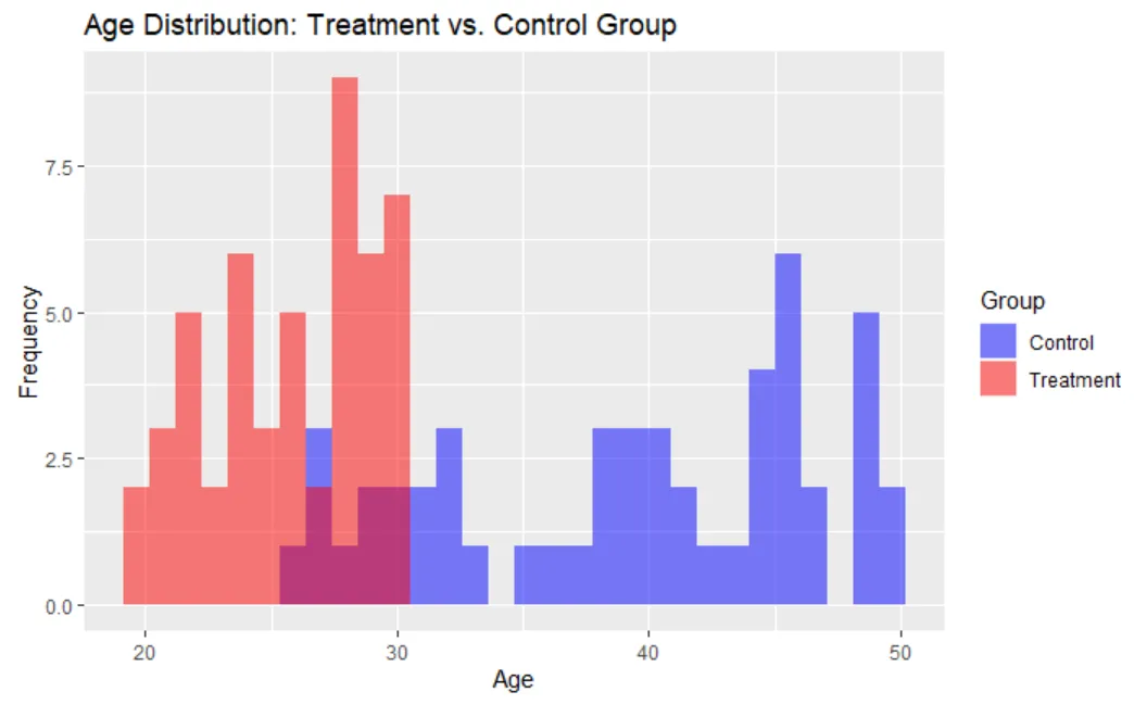 labs(title = "Age Distribution: Treatment vs. Control Group",