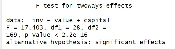 The pFtest result provides the test statistics, its associated p-value, and the degrees of freedom. If the p-value is less than your chosen significance level (e.g., 0.05), you can reject the null hypothesis and conclude that (two-way) fixed effects are present in the model. In this case, the null hypothesis is rejected and therefore the FE model is preferred over the pooled OLS model.