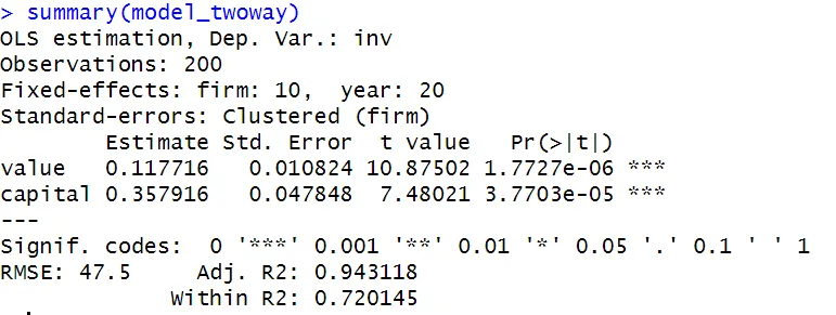 model_twoway <- feols(invest ~ value + capital | firm + year,