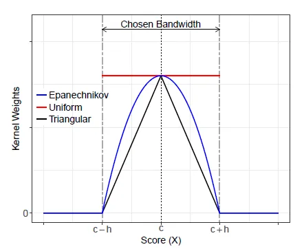 The observations near the cutoff can be seen as a neighborhood, defined as $c-h$ and $c+h$, where $h>0$ is called bandwidth. The observations that are closer to the cutoff receive more weight than those further away, which is achieved by a weighting scheme . These weights are obtained with a kernel function $K(.)$.