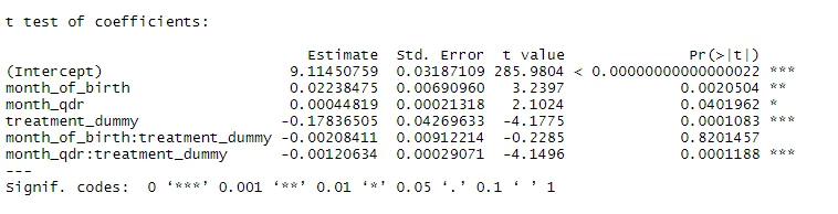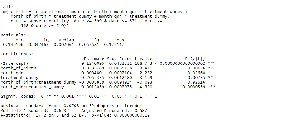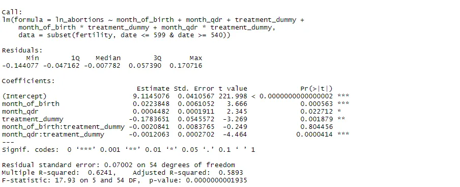 rdit <- lm(ln_abortions ~ month_of_birth + month_qdr + treatment_dummy + month_of_birth*treatment_dummy + month_qdr*treatment_dummy, subset(fertility, date <= 599 & date >= 540))