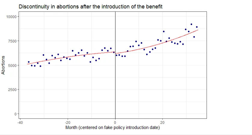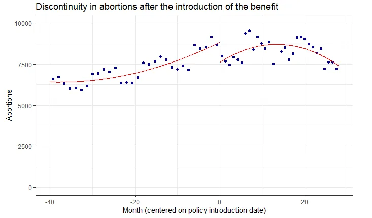 with(subset(fertility, date >= 540 & date <=599), rdplot(y = abortions, p=2, x = month_of_conception, nbins=30, y.lim = c(0, 10000), title="Discontinuity in abortions after the introduction of the benefit", x.label="Month (centered on policy introduction date)", y.label="Abortions"))
