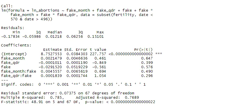 placebo <- lm(ln_abortions ~ fake_month + fake_qdr + fake + fake*fake_month + fake*fake_qdr, subset(fertility, date <= 569 & date >= 497))