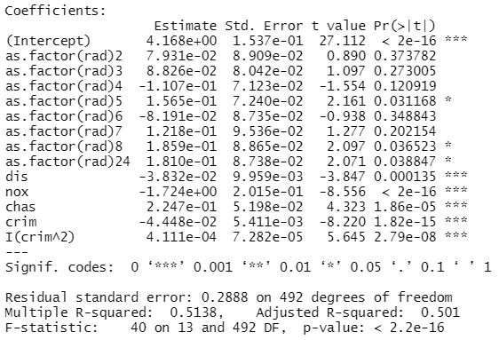 mod <- lm(log(medv) ~ as.factor(rad) + dis + nox + chas + crim + I(crim^2), data = Boston)