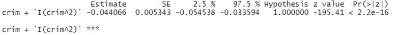 Now let's calculate the combined effect of the first order crime rate per capita (crim) with the second order crim. The deltaMethod function takes as first argument the regression object, followed by the names of the coefficients between quotes: