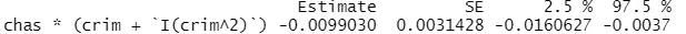 Alternatively, we can calculate the effect of the Charles River dummy (chas) multiplied with the previous combination of first and second order crime rate per capita.