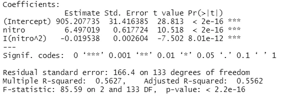 Next we run a quadratic regression between income as a dependent variable, and the nitrogen use as an independent variable.
