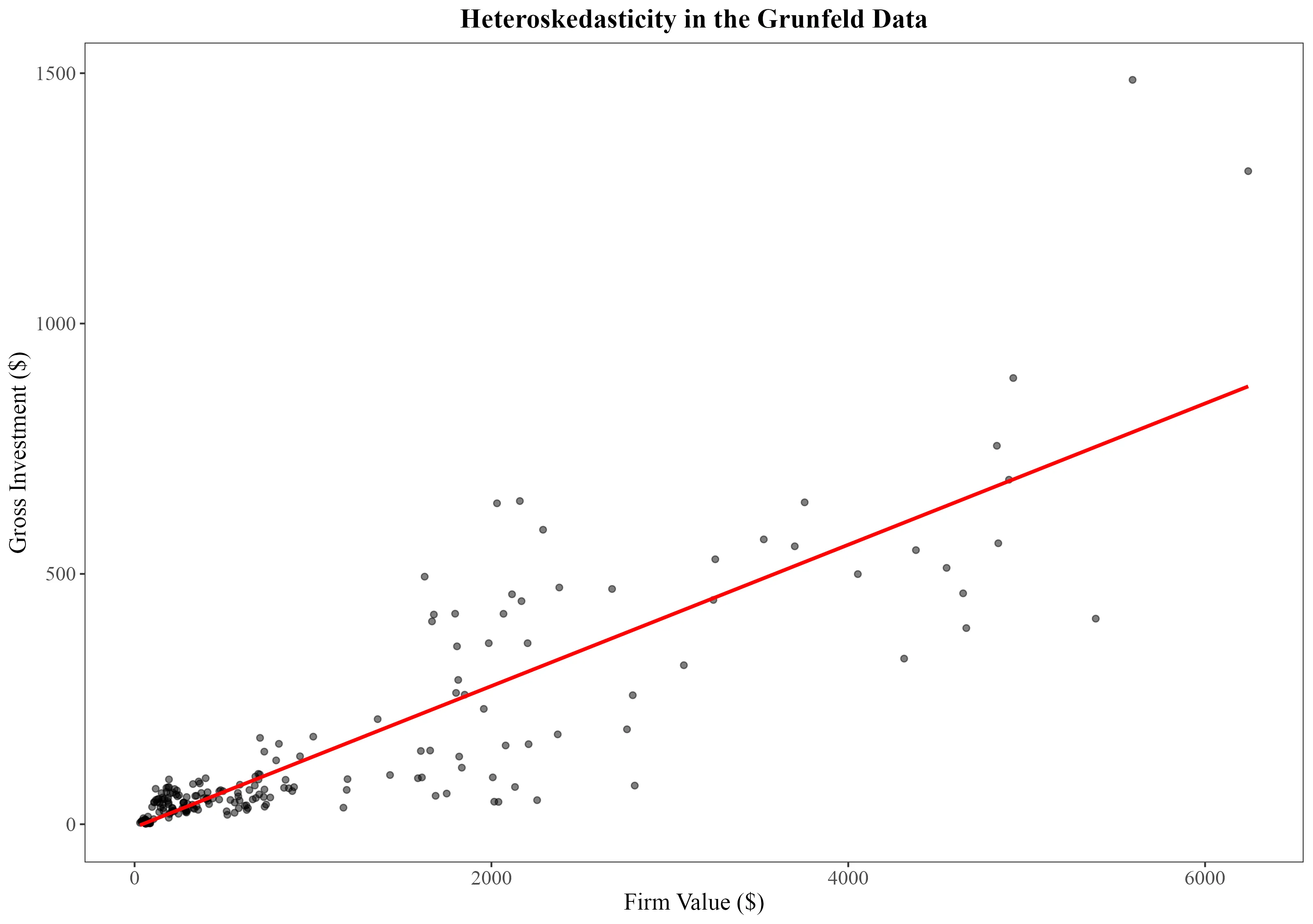 This article uses the Grunfeld data to investigate heteroskedasticity effects concerning firm gross investment and market value. The regression is executed using the plm() function from the plm package in R.