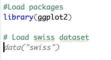 As a first library, the package ggplot2 is needed for visualization and load of the dataset "swiss".