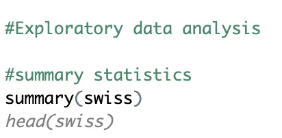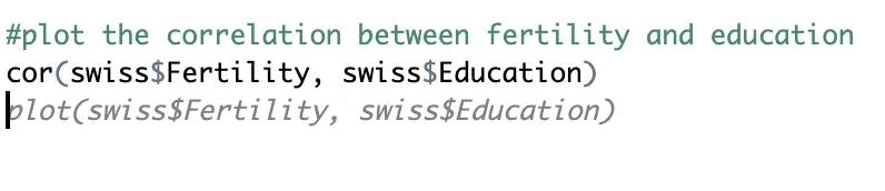 For example, if we are researching demographic patterns in Switzerland, it could be interesting to understand how education influences family planning decisions. Accordingly, we want to know the summary statistics for two variables (e.g. fertility and education) and their correlation. Simply write it in a comment format (using #) and Copilot will provide the code as shown below.
