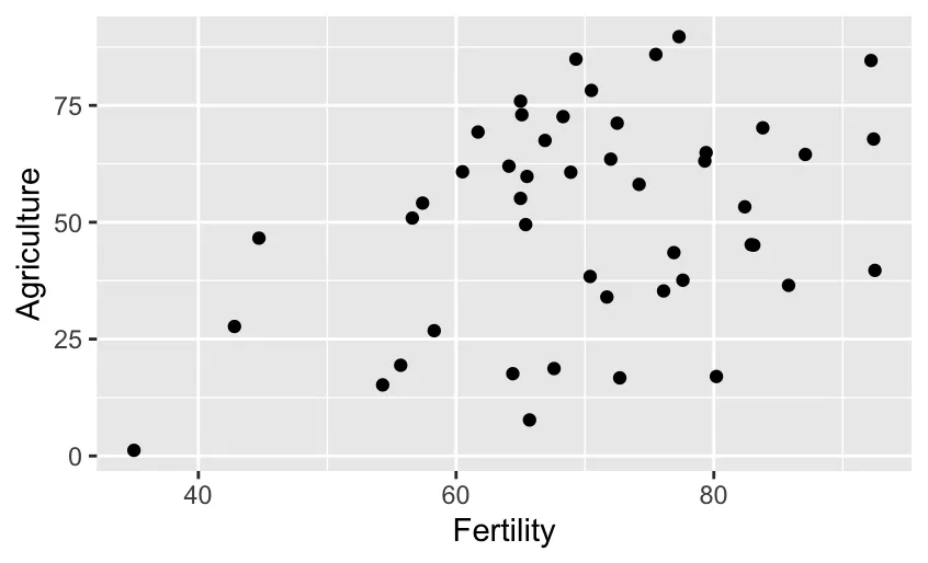 ggplot(data = swiss, aes(x = Fertility, y = Agriculture)) + geom_point()
