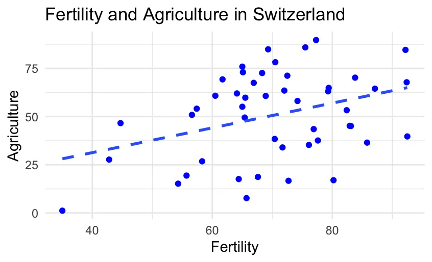 ggplot(data = swiss, aes(x = Fertility, y = Agriculture)) + geom_point(color = "blue") + theme_minimal() + labs(title = "Fertility and Agriculture in Switzerland") + geom_smooth(method = "lm", se = FALSE, linetype = "dashed")