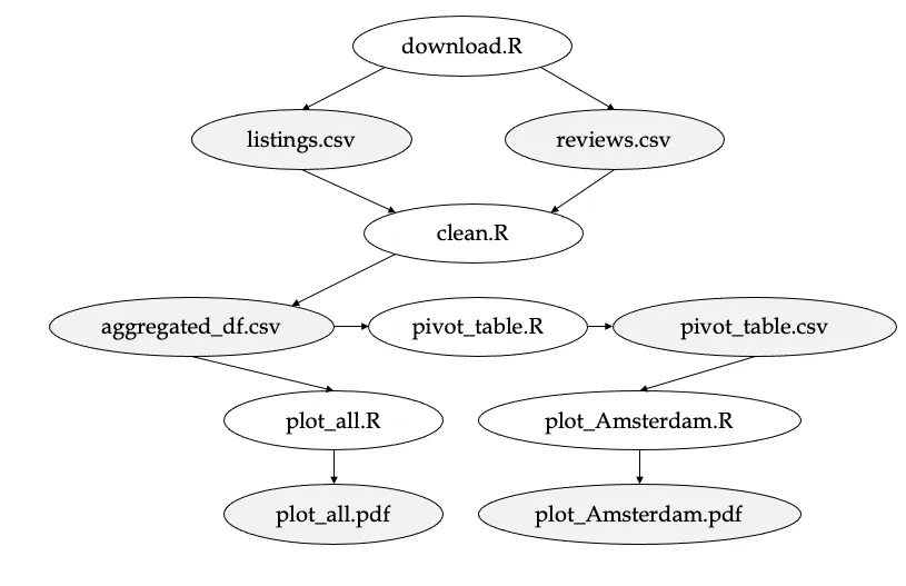 As you've worked through the set of exercises, you've repeatedly built on preliminary results. For example, the plot for the top 3 cities in Amsterdam (plot_Amsterdam.pdf) could only be created once the pivot_table.csv file had been generated. In a similar way, the preprocessing pipeline (clean.R) could only take place once the data (listings.csv & reviews.csv) had been downloaded. These dependencies have been depicted in the figure below.