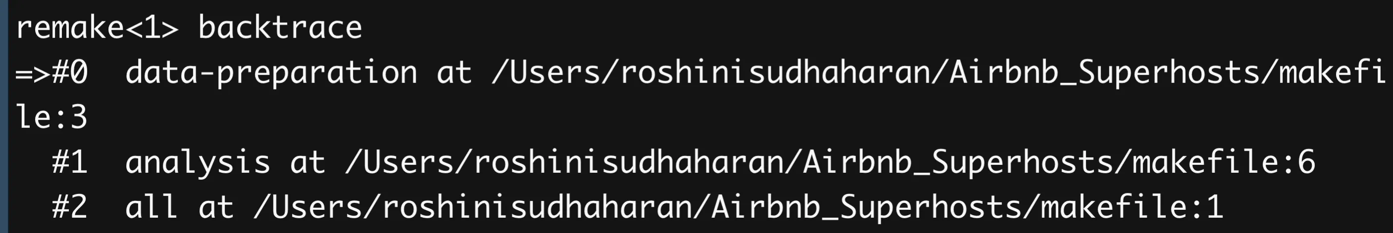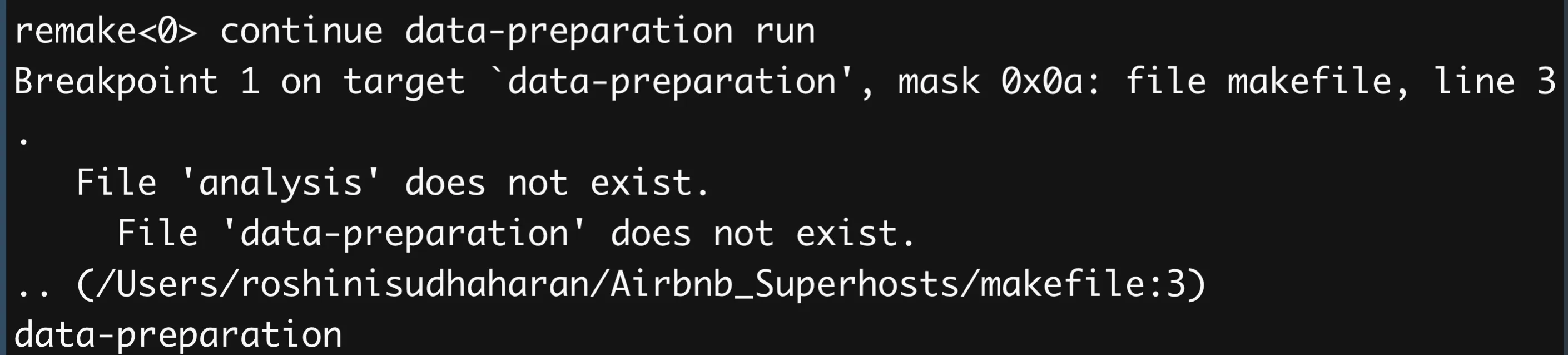 Here, the dependency for the target ‘analysis’ was ‘data-preparation’. Later, the debugger stopped after dependency checking, as shown by the .. icon rather than ->.