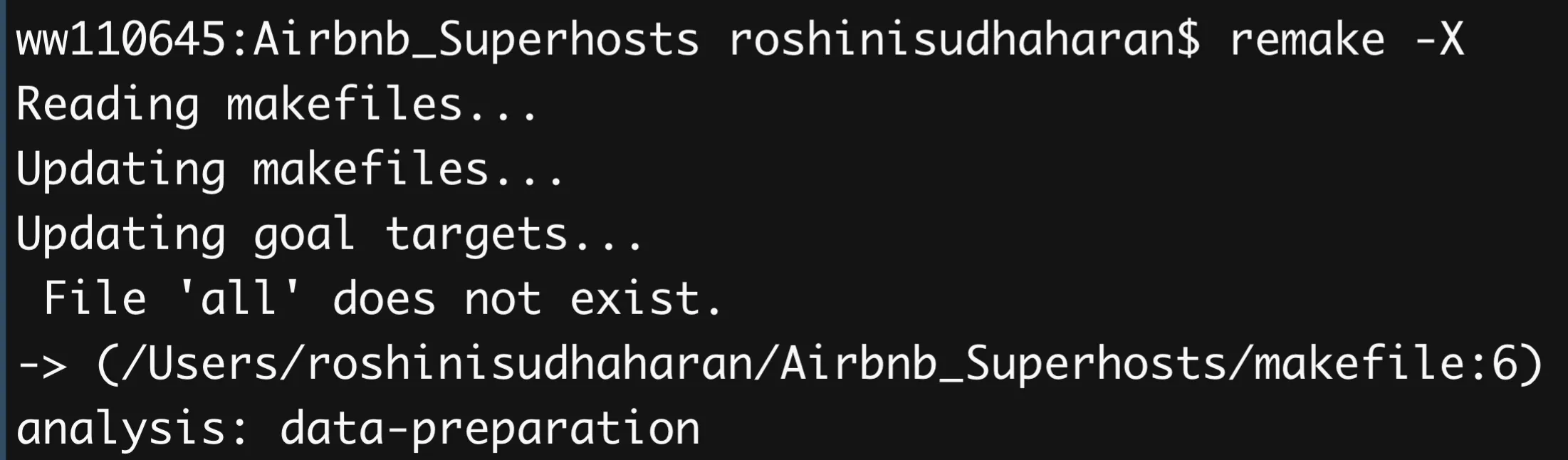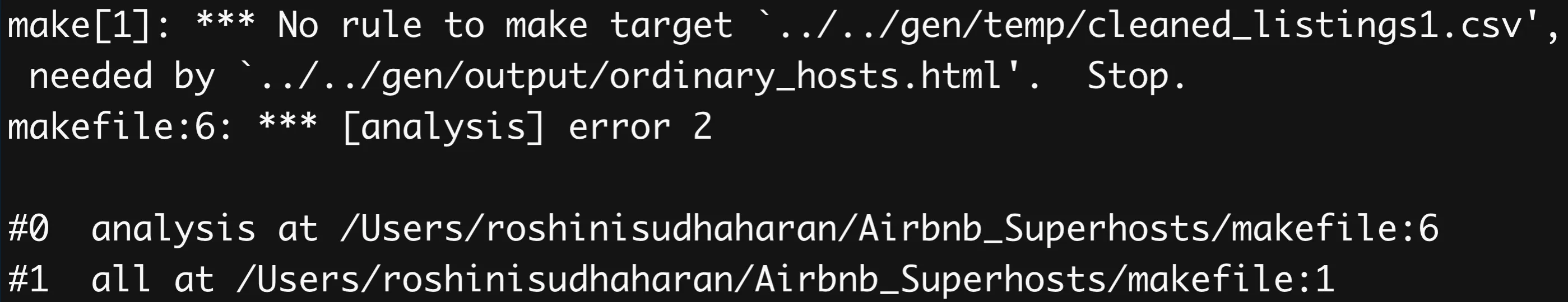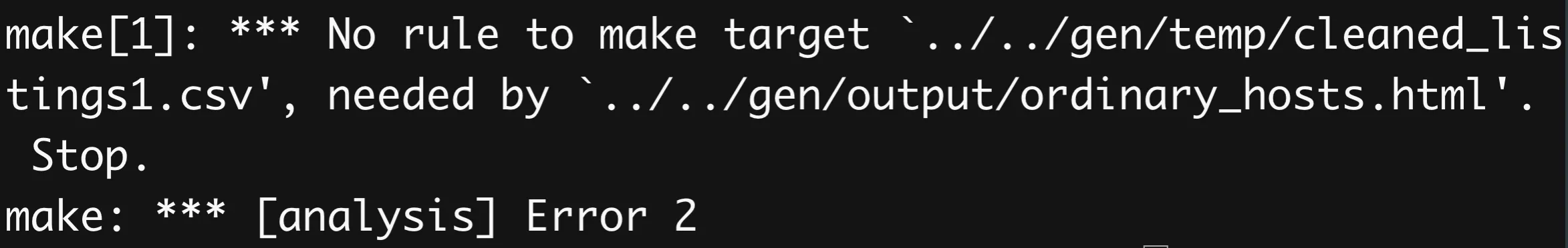 └── makefileSuppose the files cleaned_listings.csv and cleaned_listings1.csv were created after running the cleaning.R script were not saved in the temp folder. The files in the output folder are dependent on these files in the temp folder which will result in an error while executing make.