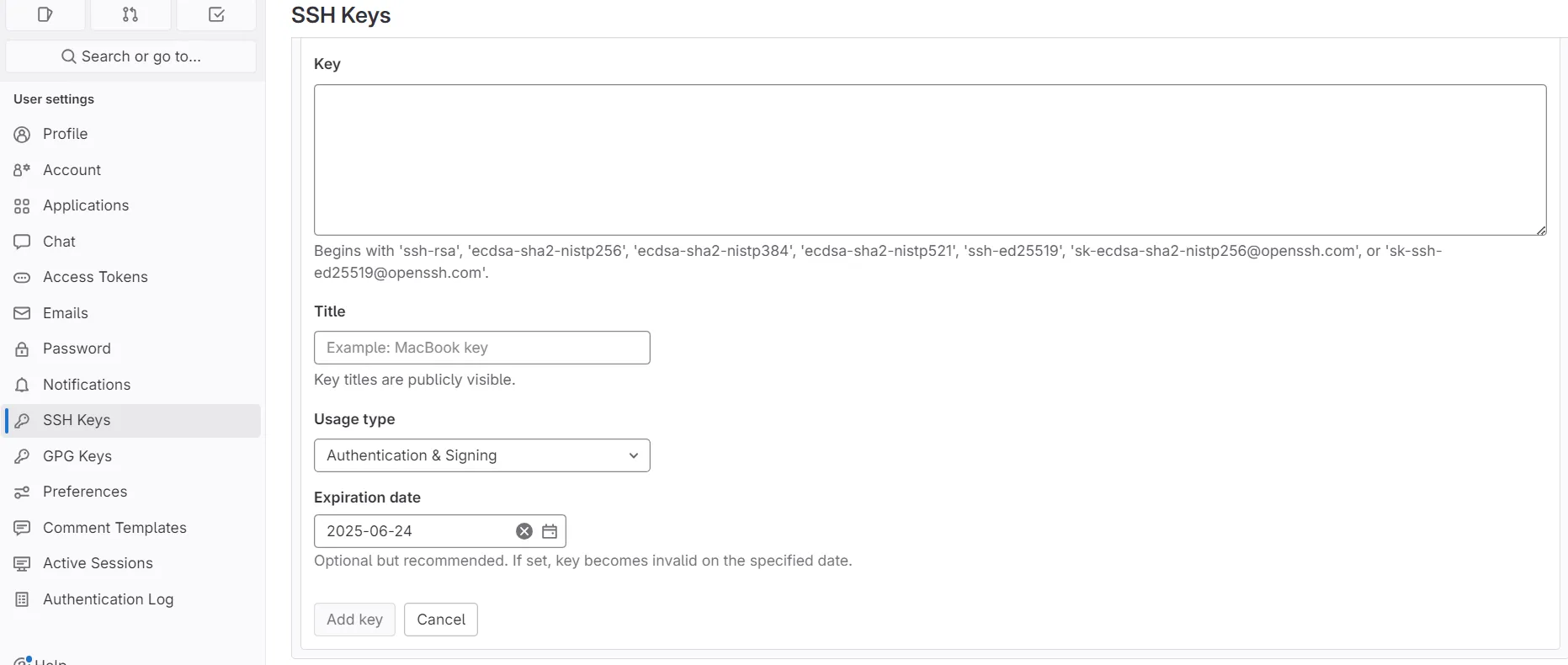 They key fingerprint is: SHA256 xxx ...Locate and copy the directory where your public key has been saved. Use File Explorer to find the file. Open it with a text editor (such as Notepad) and copy its contents, including the ssh-rsa part at the beginning. Next, log in to your GitLab account and navigate to User settings -> SSH Keys -> Add new key. Paste the copied key into the provided field. Optionally, you can specify a title and an expiry date for the key. Refer to the image below for guidance.
