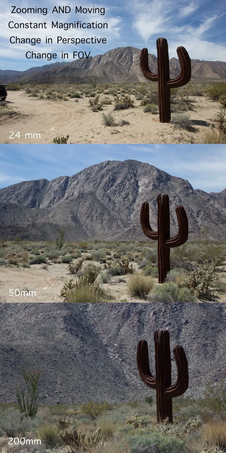 However, to make things even more complicated, depth of field depends not only on the lens aperture, but also on the focal length! Longer focal lengths allow for a shallower depth of field. In the next image, notice how the cactus stays relatively the same while the background changes dramatically.