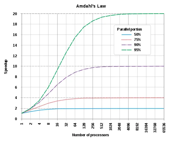 Despite these challenges, it is often worthwhile to consider parallelization, especially when code needs to be executed repeatedly, such as in reproducible research pipelines. A key concept to understand in this context is Amdahl's Law, which posits that the potential speedup of a task is limited by the number of cores available and the proportion of the task that can be parallelized. This principle is depicted in the following graph from Wikipedia: