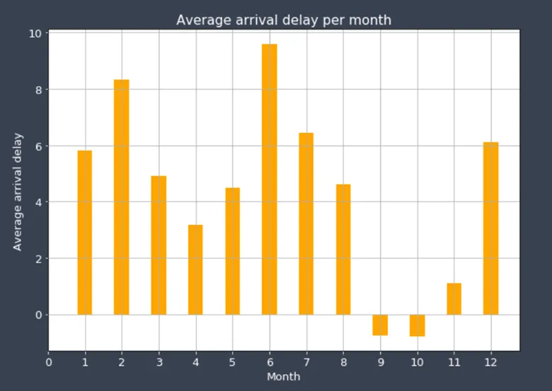 We might also want to know if the average delay is different across months. For example, delays could be higher in winter due to snowstorms and inclement weather. We start by first checking if the data contains delays for all months of the year. Then, we compute the mean arrival delays by grouping them per month.