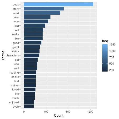 ggplot(df_plot, aes(x = reorder(term, +freq), y = freq, fill = freq)) + geom_bar(stat = "identity")+ scale_colour_gradientn(colors = terrain.colors(10))+ xlab("Terms")+ ylab("Count")+coord_flip()