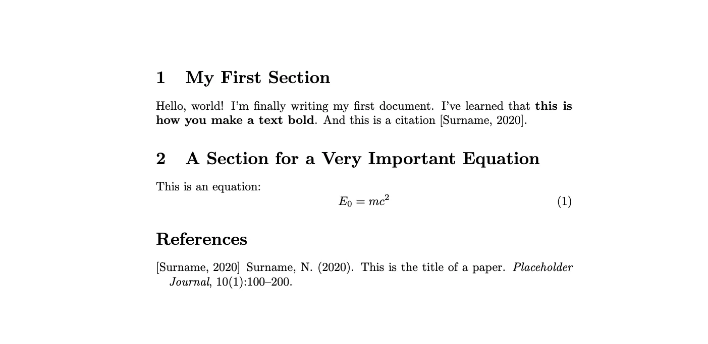 Hello, world! I'm finally writing my first document. I've learned that \textbf{this is how you make a text bold}. And this is a citation \cite{surname2020placeholder}.