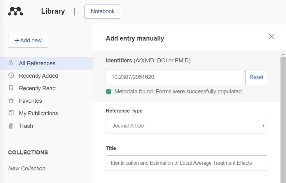 - For minor changes, you can click on the article in the Reference Manager and modify the information manually. You can additionally add any extra information (e.g., pages) or add annotations to the reference.