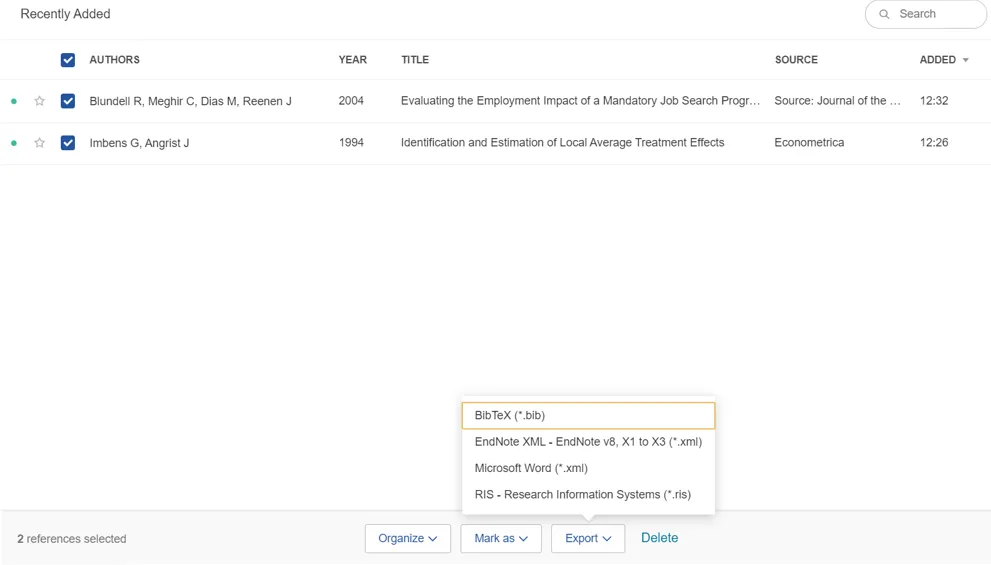 You can export references directly into a BibTex, EndNote, Word, or RIS file. To do so: