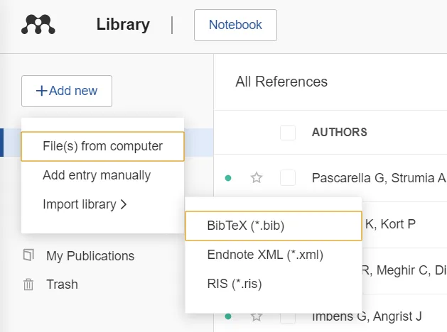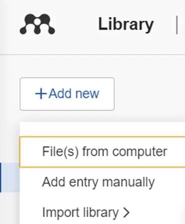 Import an existing library. Do you already have a reference list in other formats such as Bibtex, Endnote, or RIS? No need to start building it over again, Mendeley Reference Manager allows you to import them easily: Go to "Add new > Import Library" and choose your desired preexisting library.