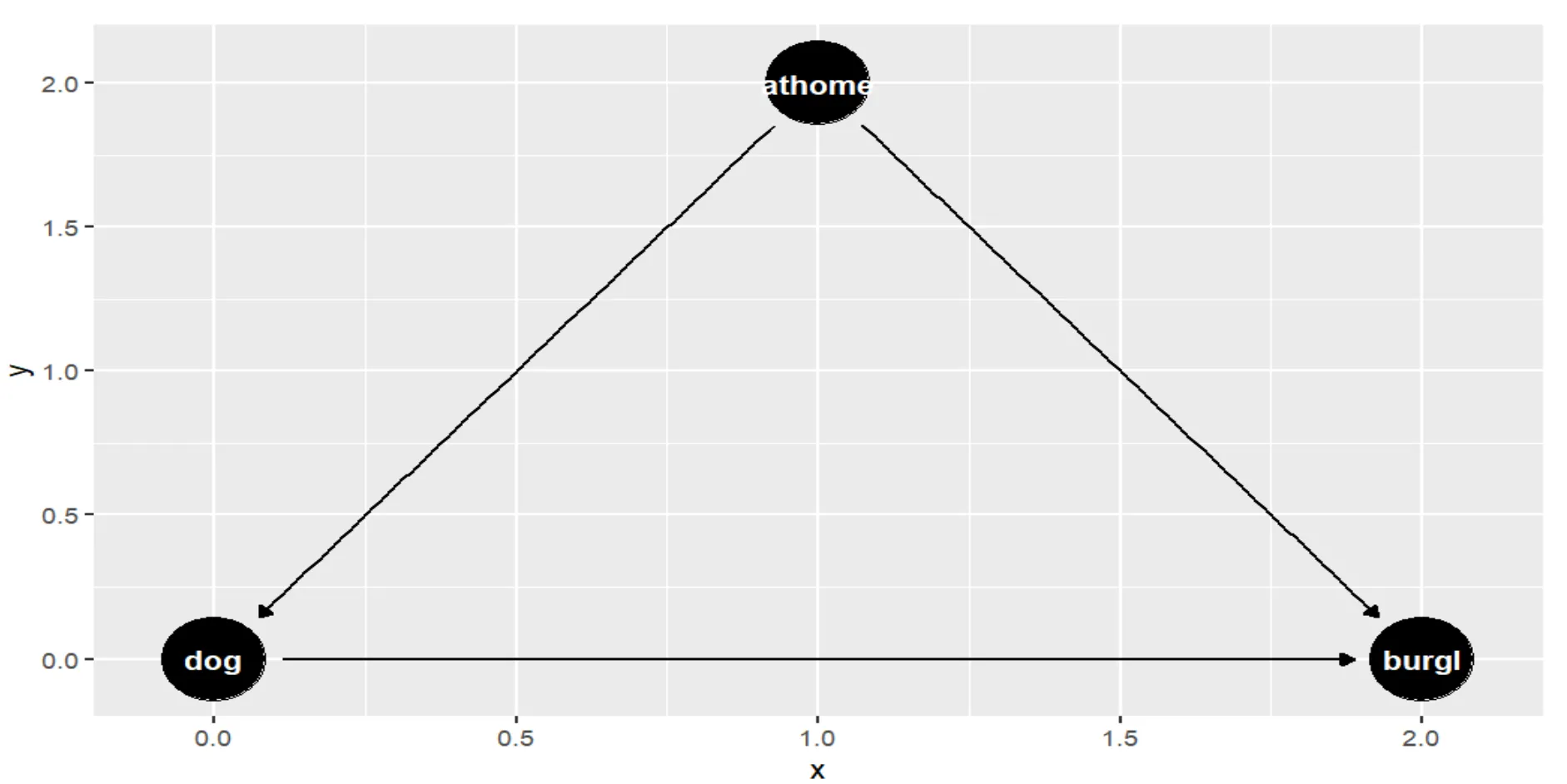 Below is an example of a causal diagram created using R, illustrating the causal relationship between owning a dog and the likelihood of experiencing a burglary. There is the confounding factor of being at home often.