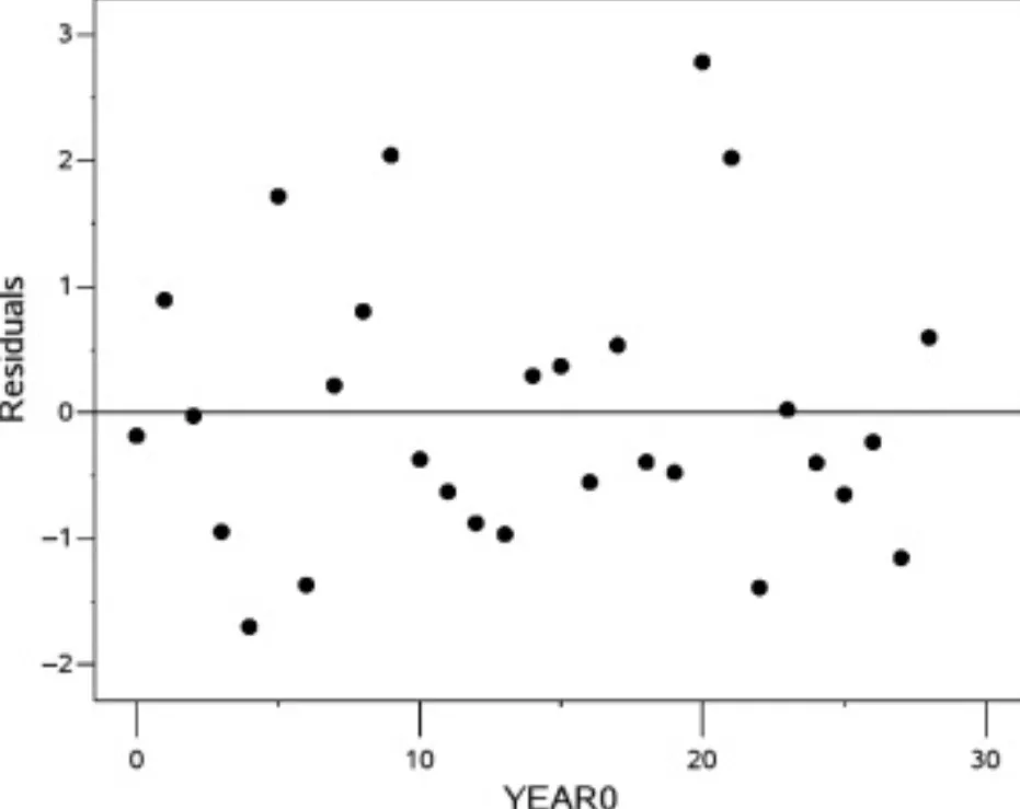 An example for a linear regression model is a residual plot. Here, the independent variable is YEAR0 = (year-1990) and the residuals represent the expected temperature for the year 1990. A random scatter of points indicates that the residuals are independent and identically distributed (i.i.d.) and the assumption holds.
