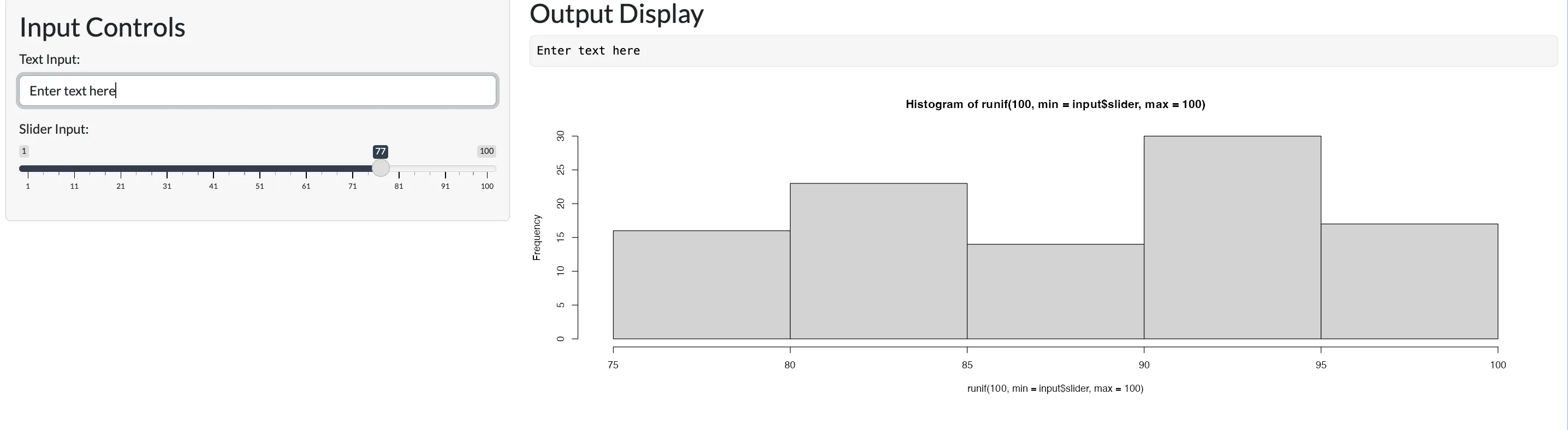 sliderInput("slider", "Slider input:", 1, 100, 30)