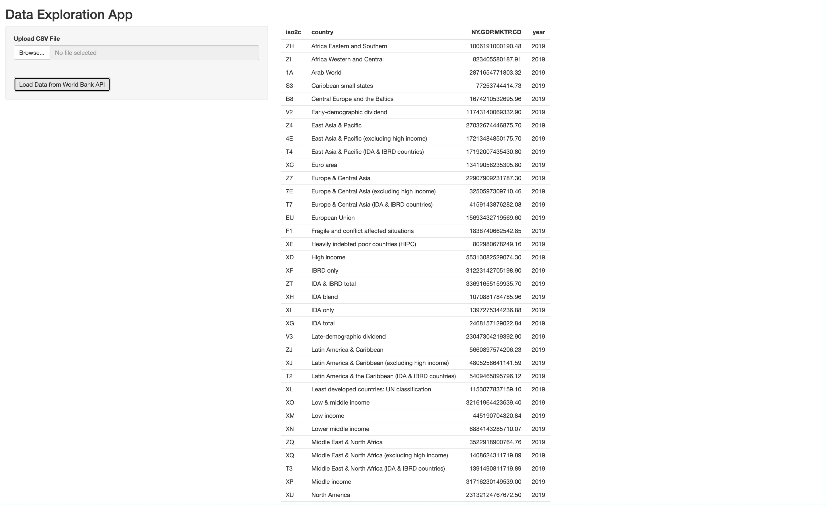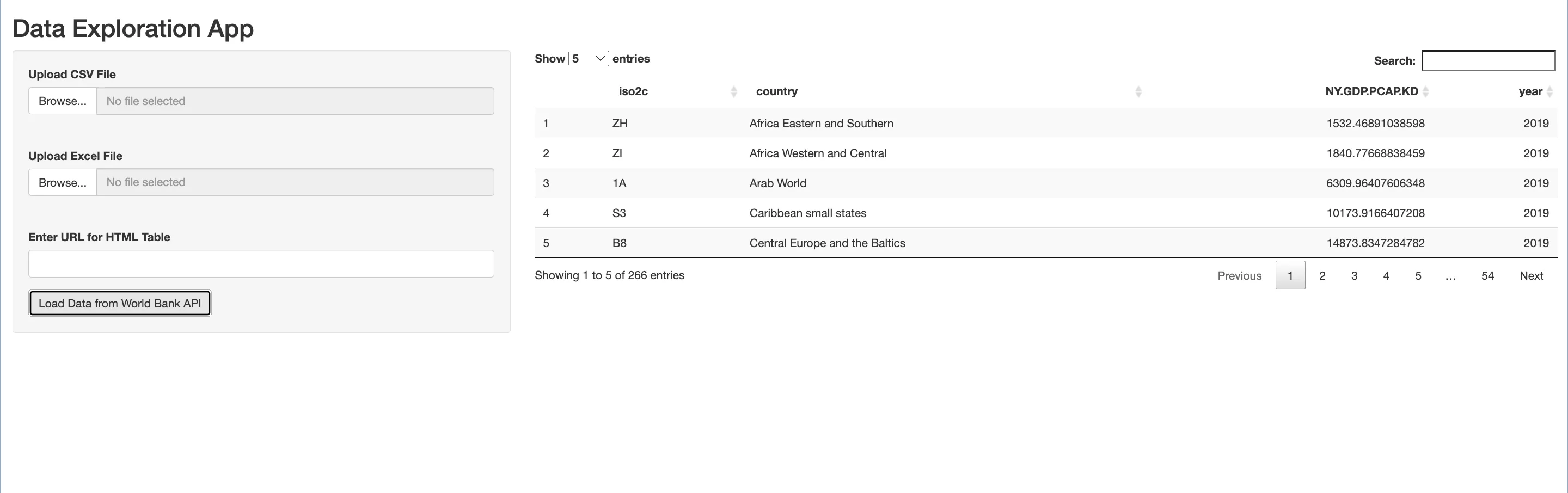 Shiny: You've learned to set up a UI inShinyfor managing various data sources.- This includes handling CSV file uploads and retrieving data from external APIs like the World Bank API.