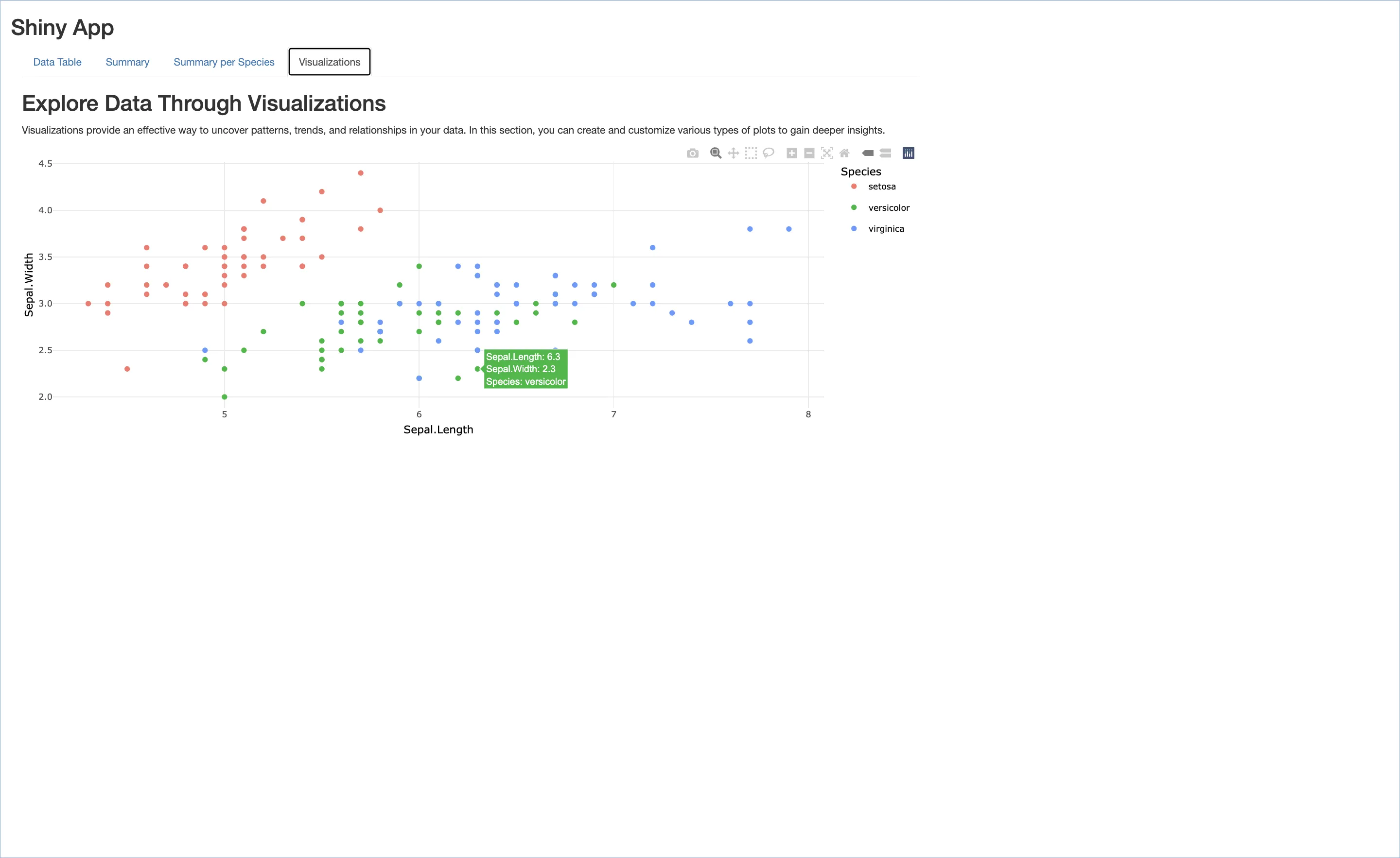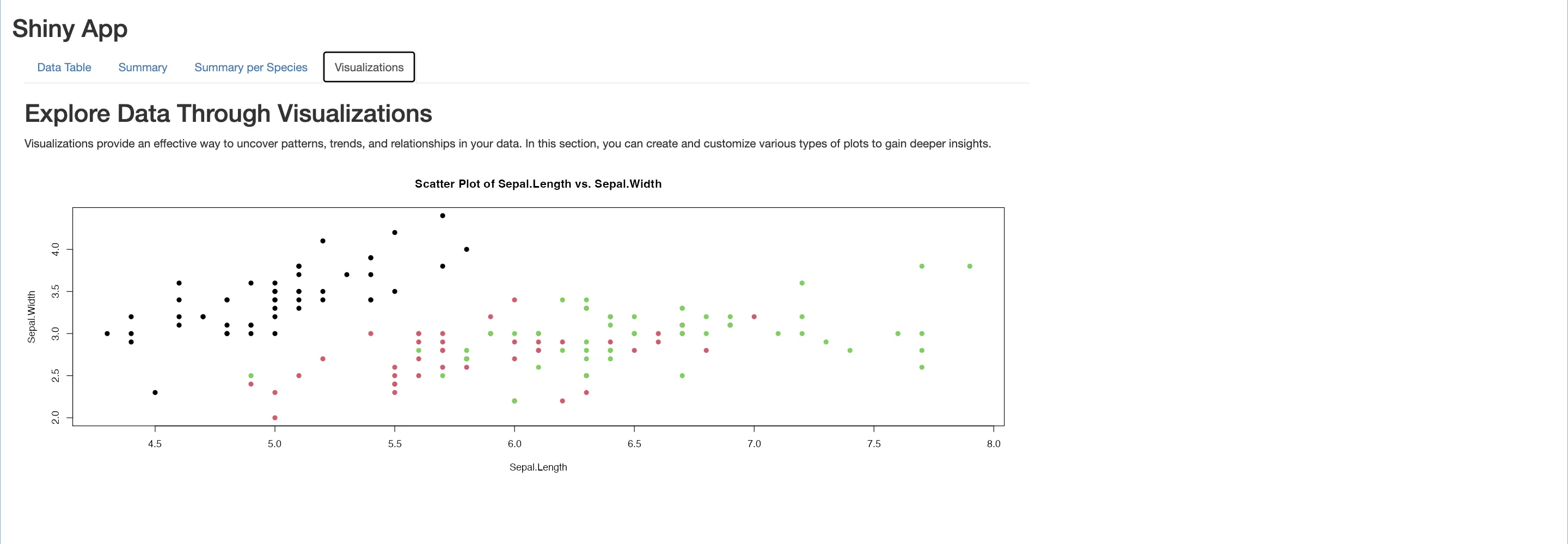 Inside the renderPlot function, you can include your code for creating data visualizations. In the provided example, we've created a scatter plot of Sepal.Length vs. Sepal.Width from the Iris dataset. You can replace this example with your preferred visualization code, whether it's bar charts, histograms, or any other type of plot that suits your data exploration goals.
