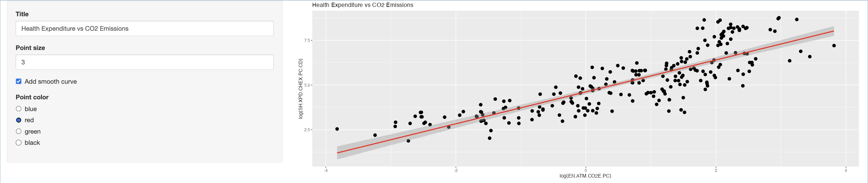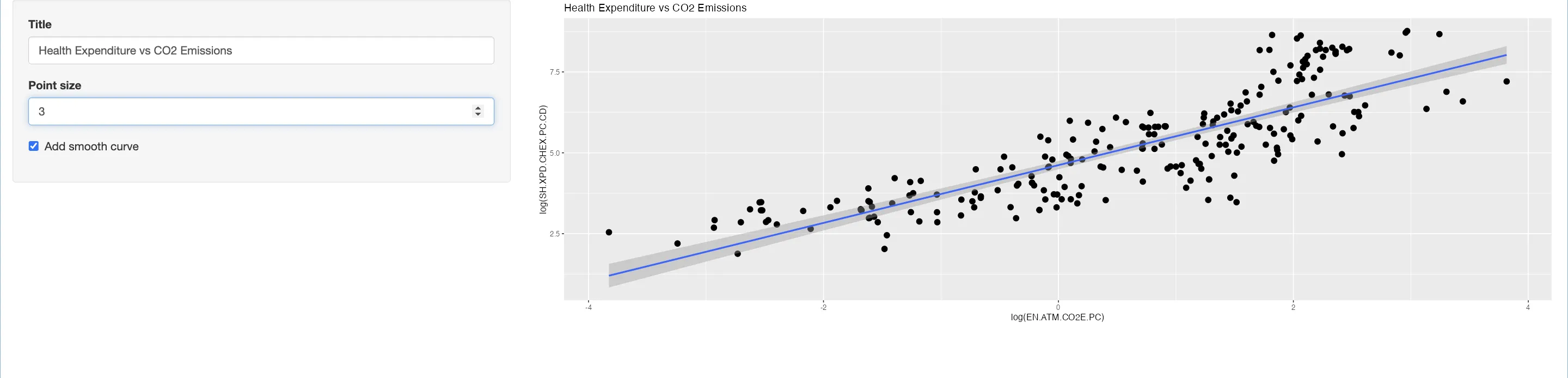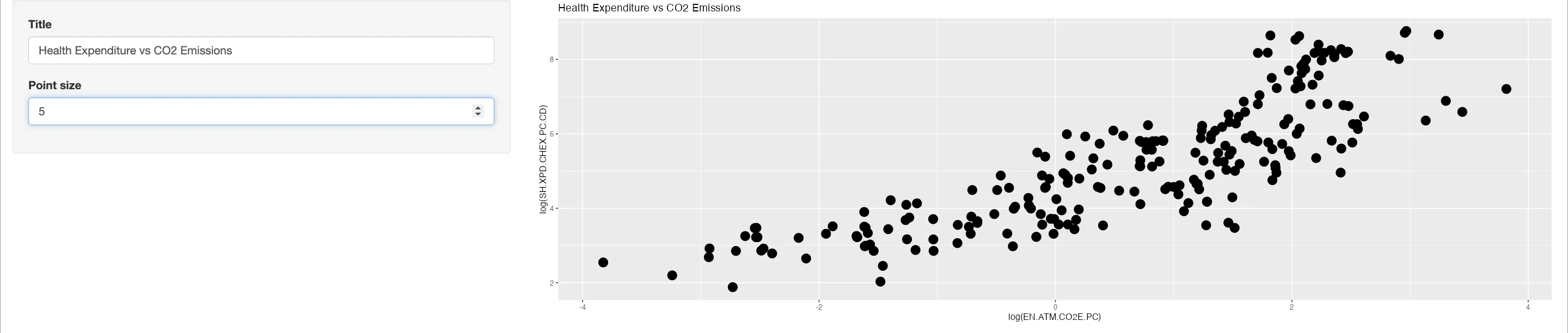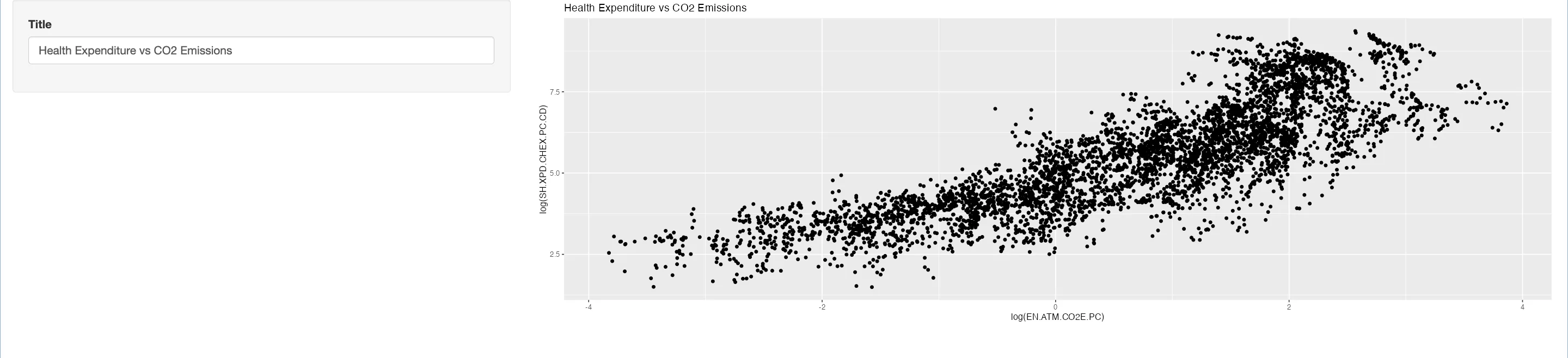 textInput("title", "Title", "Health Expenditure vs CO2 Emissions")