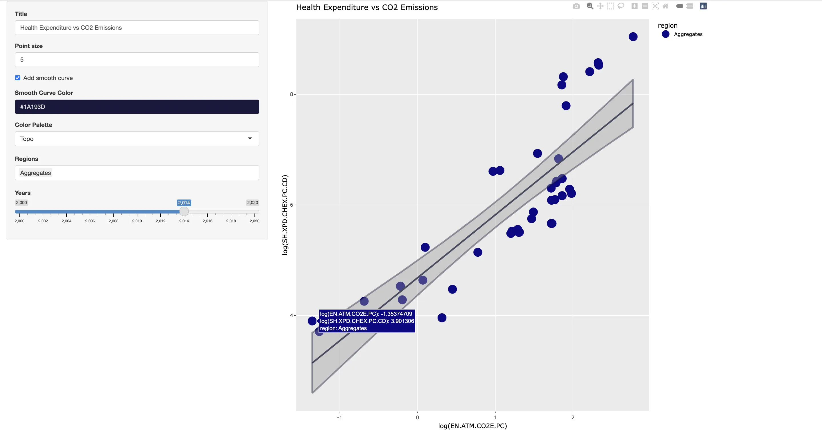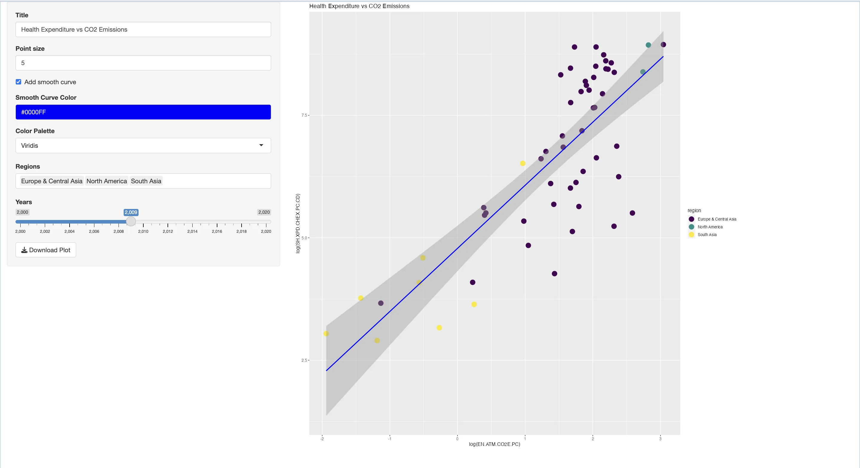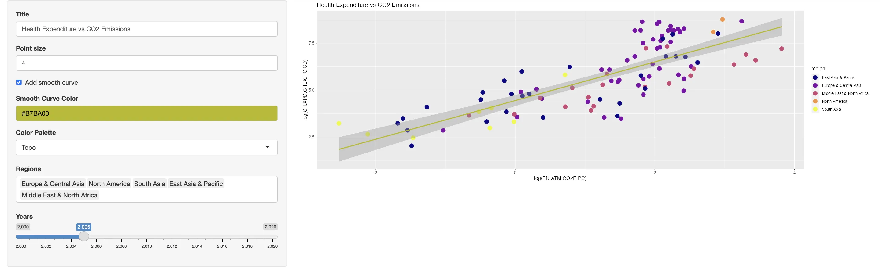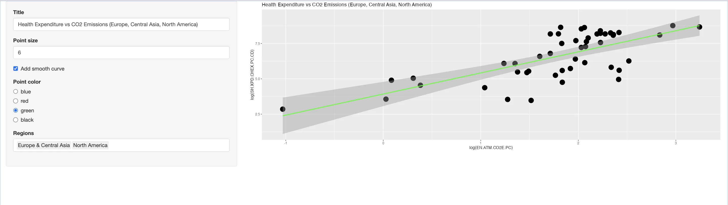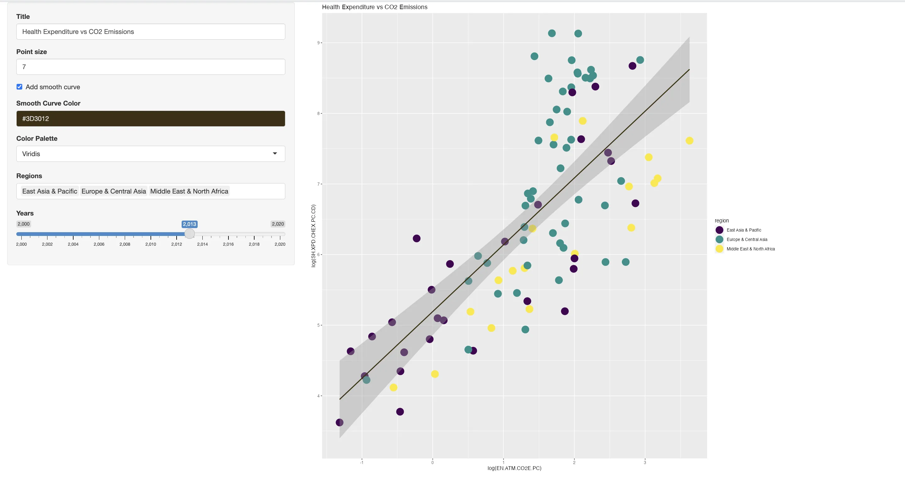 textInput("title", "Title", "Health Expenditure vs CO2 Emissions")