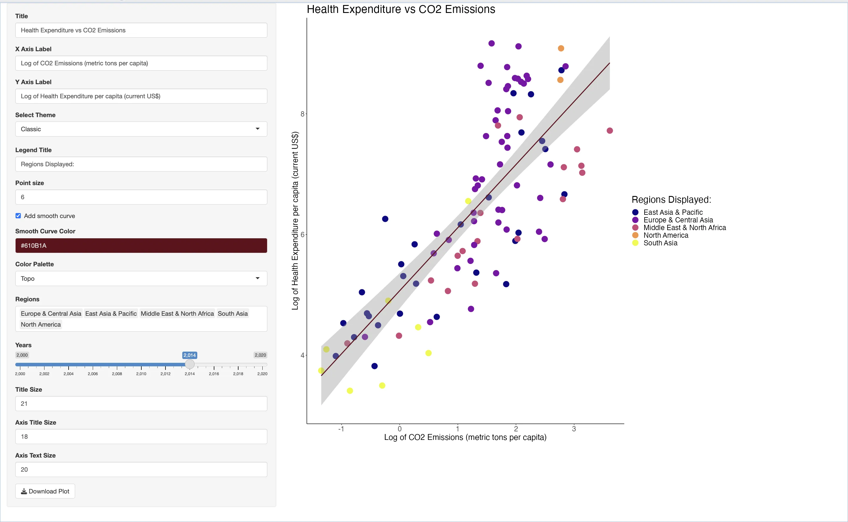 text inputsfor plot titles and axis labels, allowing users to personalize their visualizations further. Additionally, the inclusion of atheme selectorprovides options for changing the overall look and feel of the plots. - Practical Output Features: The app includes a download function, enabling users to save their customized plots for use in presentations or reports.