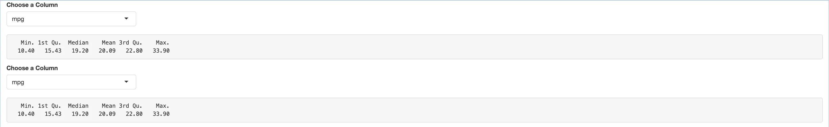 In this example, we use two instances of the same module, demonstrating the reusability of Shiny modules. Each instance operates independently, allowing users to select different columns and view their summaries separately.