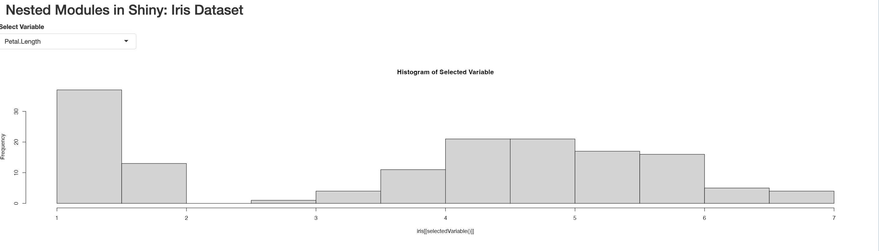 ns("innerModule"), ensuring proper namespacing. - The Outer module's server function then utilises the selected variable from the inner module to render the histogram.